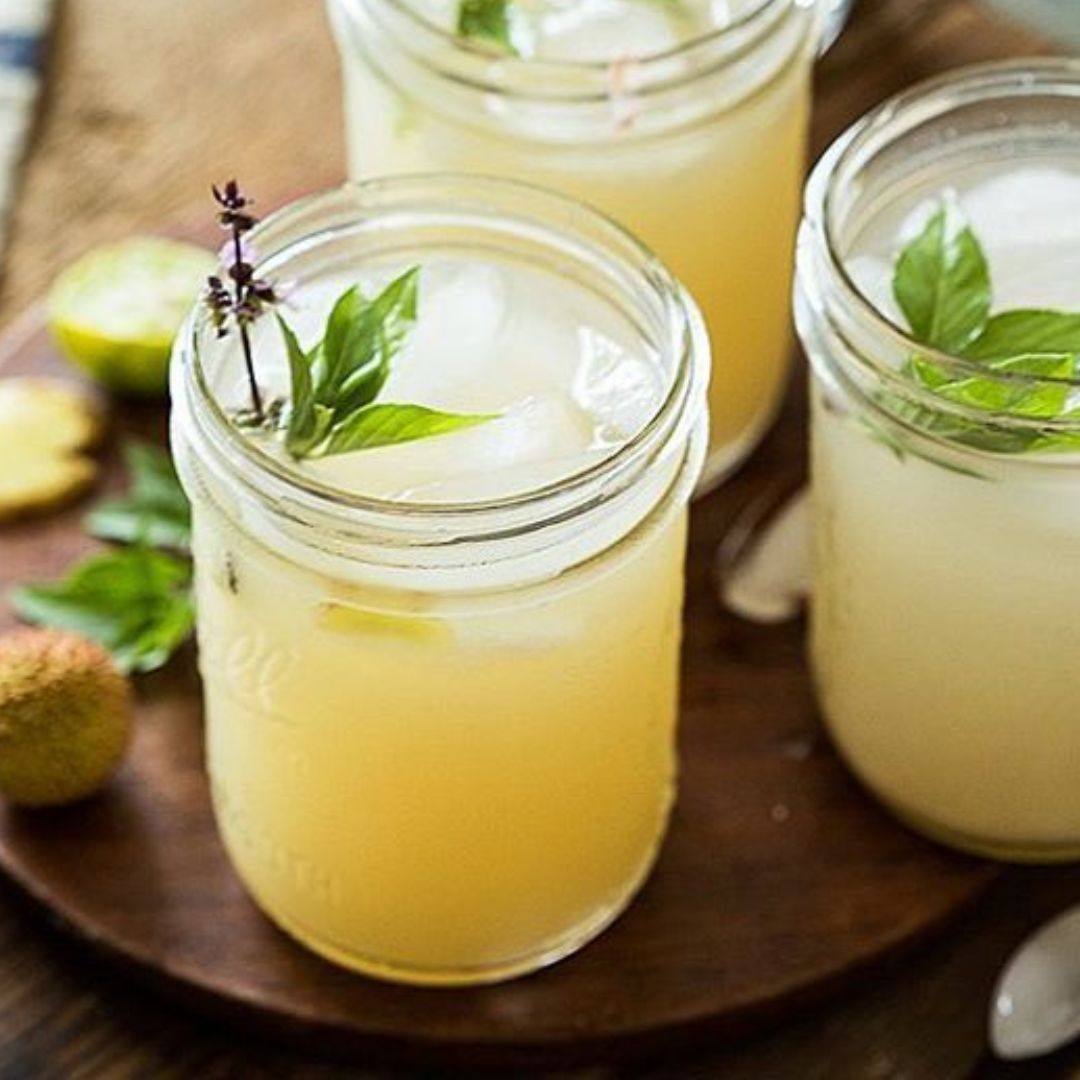 Fresh Lime Juice and Thai Basil Simple Syrup in a 150z togo flask.